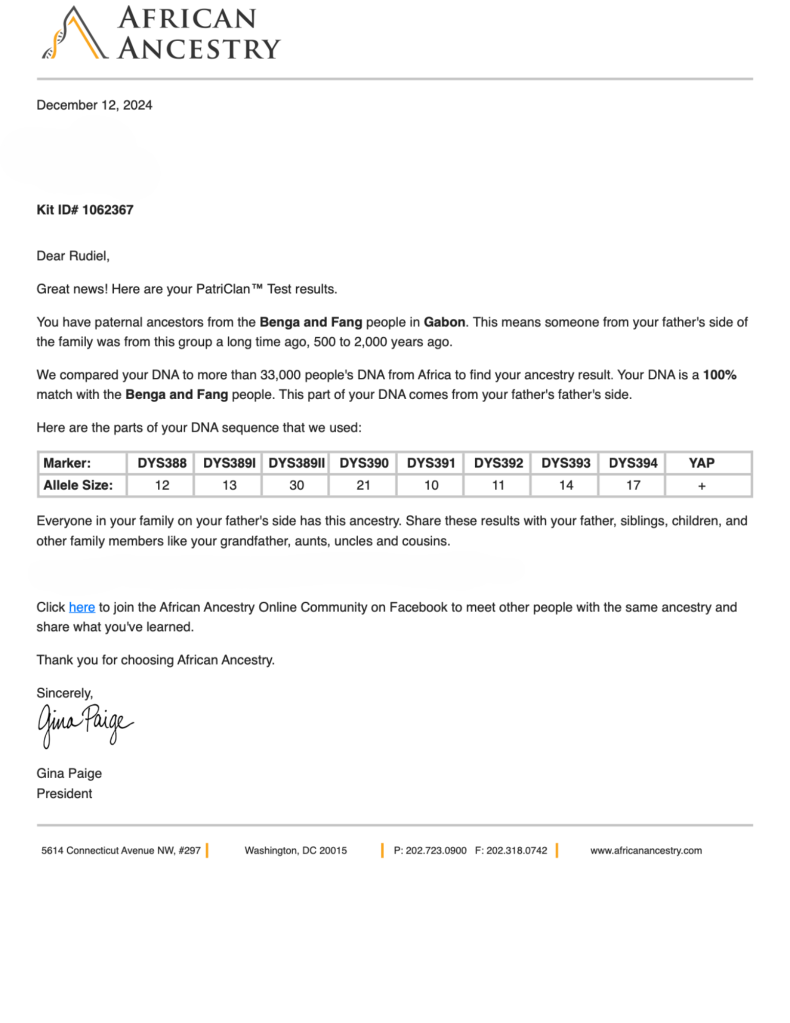 Welcome to your family’s DNA story! This page is dedicated to preserving the paternal lineage of Ulysses Pilgrim(Sappy) passed down through countless generations of your family. For both the Banga and Fang peoples, this heritage is carried through the male line, representing the DNA inherited from fathers to sons, reaching back through millennia. This certification documents your unique paternal ancestry, tracing this unbroken chain of inheritance. While daughters play a vital role in the family, this specific DNA chain follows the path of fathers and sons throughout history.